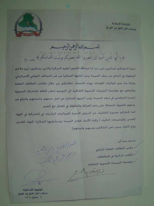 ![]() عصائب اهل الحق التابعة لحكومة المالكي، تدفع الشيعيات العراقيات للذهاب الى سوريا من اجل زواج المتعة بشبيحة بشار الاسد !